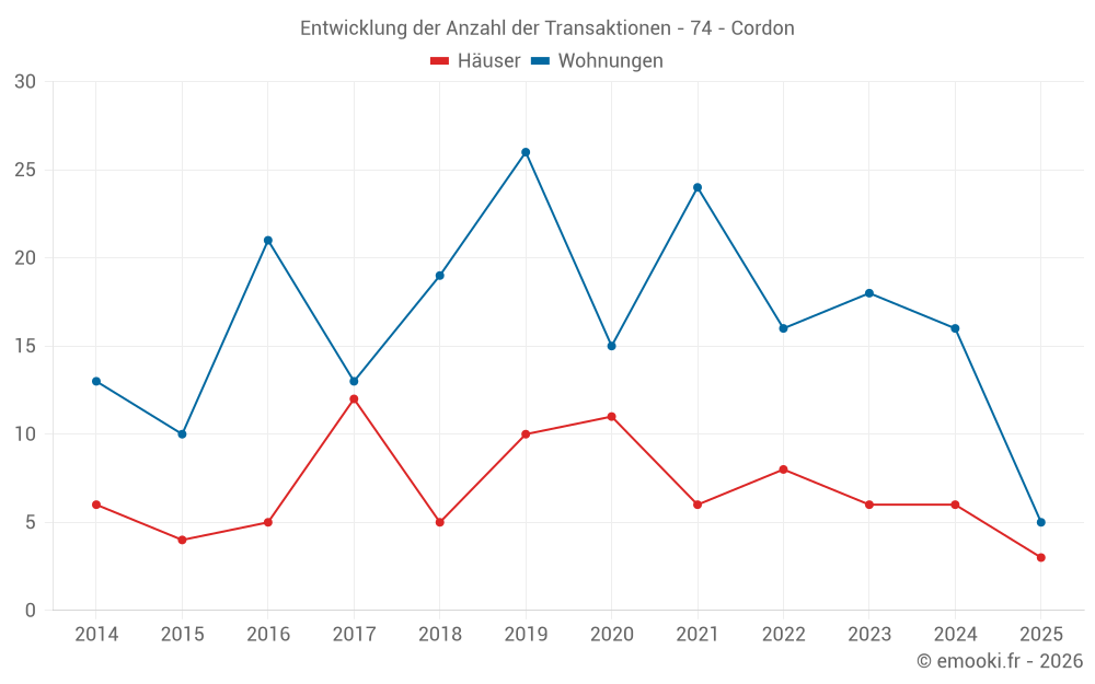 Der Durchschnittspreis auf den 32 Wohnungstransaktionen der letzten 24 Monate in der Gemeinde Cordon betrug 4 720 € pro Quadratmeter für einen mittleren Immobilienwert von 193 700 €. Über diesen Zeitraum hinweg lagen 60% der Transaktionen zwischen 3 663 und 6 153 € pro Quadratmeter (vom 2. bis zum 8. Dezil).