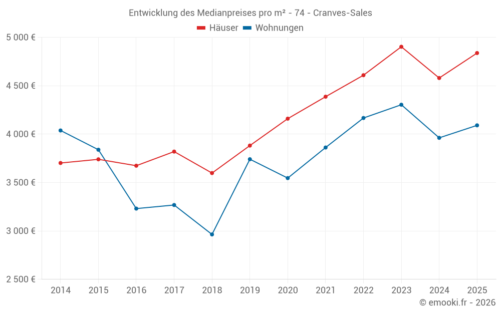 Der Durchschnittspreis auf den 24 Wohnungstransaktionen der letzten 12 Monate in der Gemeinde Cranves-Sales betrug 4 002 € pro Quadratmeter für einen mittleren Immobilienwert von 287 275 €. Über diesen Zeitraum hinweg lagen 60% der Transaktionen zwischen 3 492 und 4 653 € pro Quadratmeter (vom 2. bis zum 8. Dezil).
