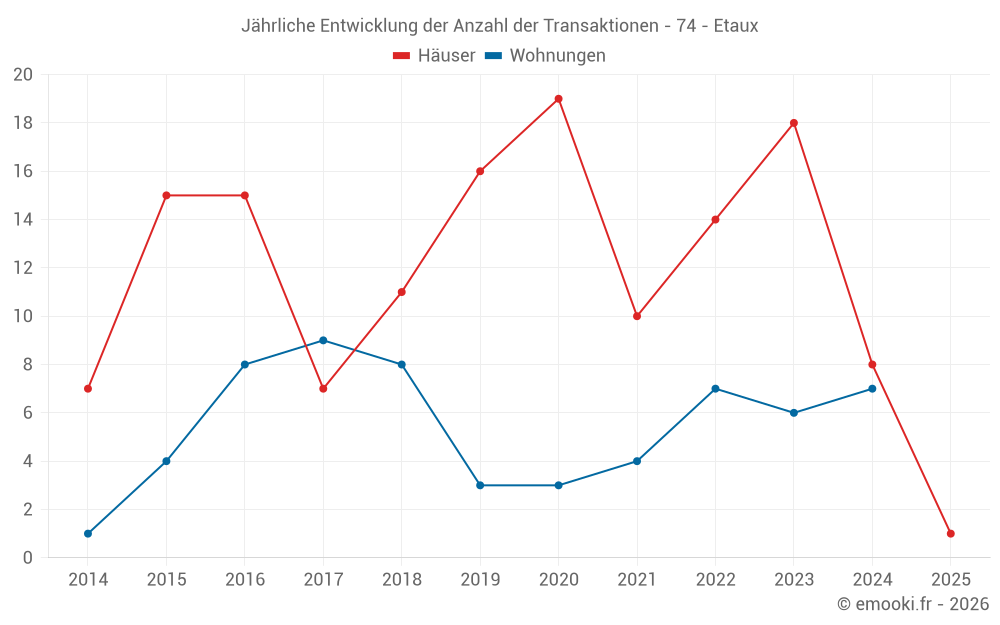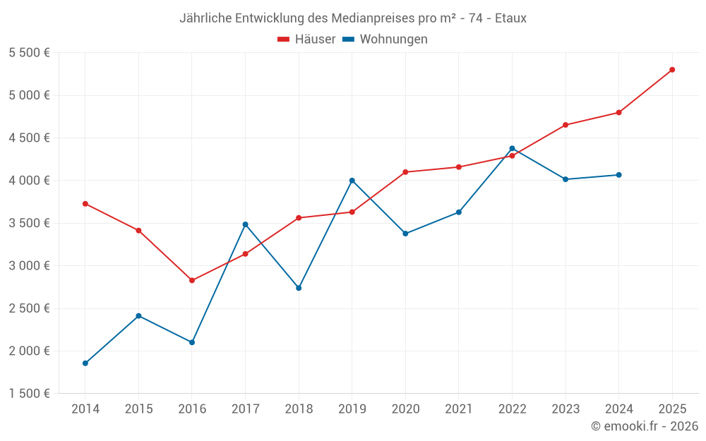 Der Durchschnittspreis auf den 20 Hausgeschäften der letzten 24 Monate in der Gemeinde Etaux betrug 4 652 € pro Quadratmeter für einen mittleren Immobilienwert von 487 000 €. Über diesen Zeitraum hinweg lagen 60% der Transaktionen zwischen 3 526 und 5 125 € pro Quadratmeter (vom 2. bis zum 8. Dezil).