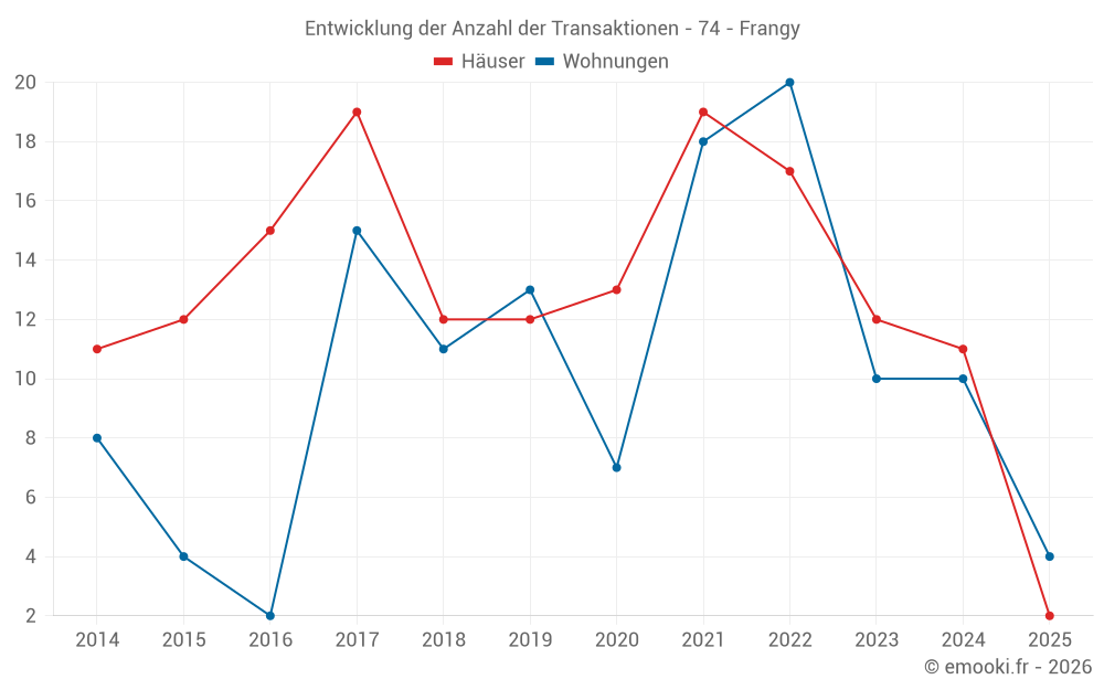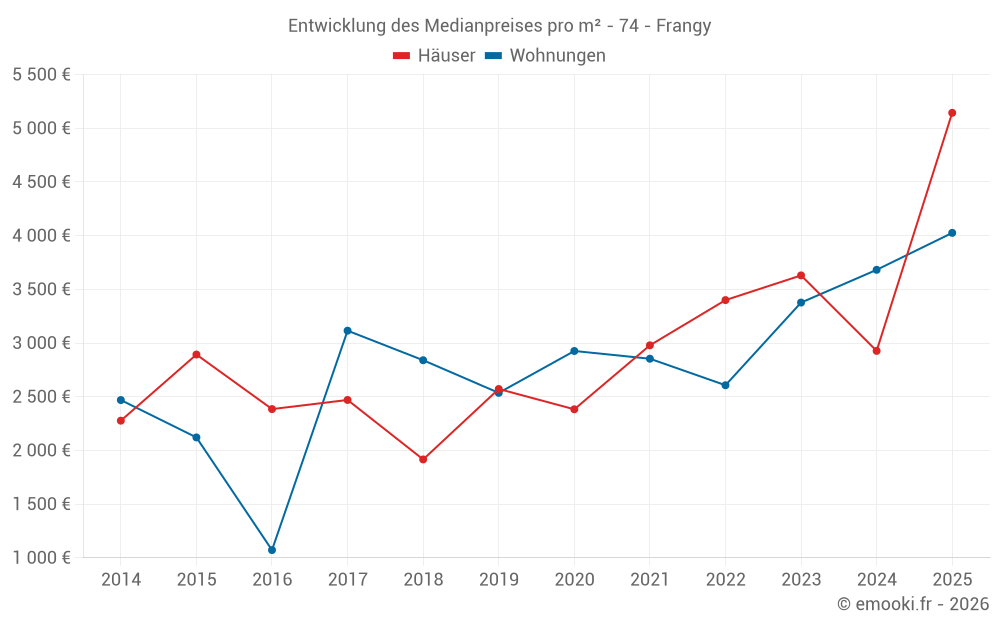 Der Durchschnittspreis auf den 18 Hausgeschäften der letzten 24 Monate in der Gemeinde Frangy betrug 2 948 € pro Quadratmeter für einen mittleren Immobilienwert von 278 175 €. Über diesen Zeitraum hinweg lagen 60% der Transaktionen zwischen 1 847 und 3 555 € pro Quadratmeter (vom 2. bis zum 8. Dezil).