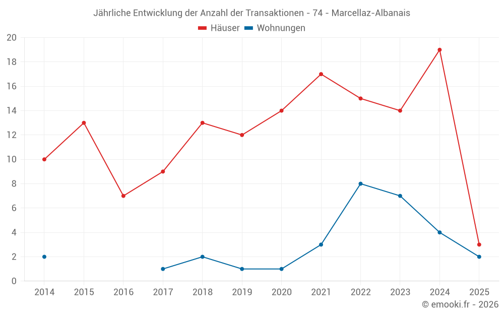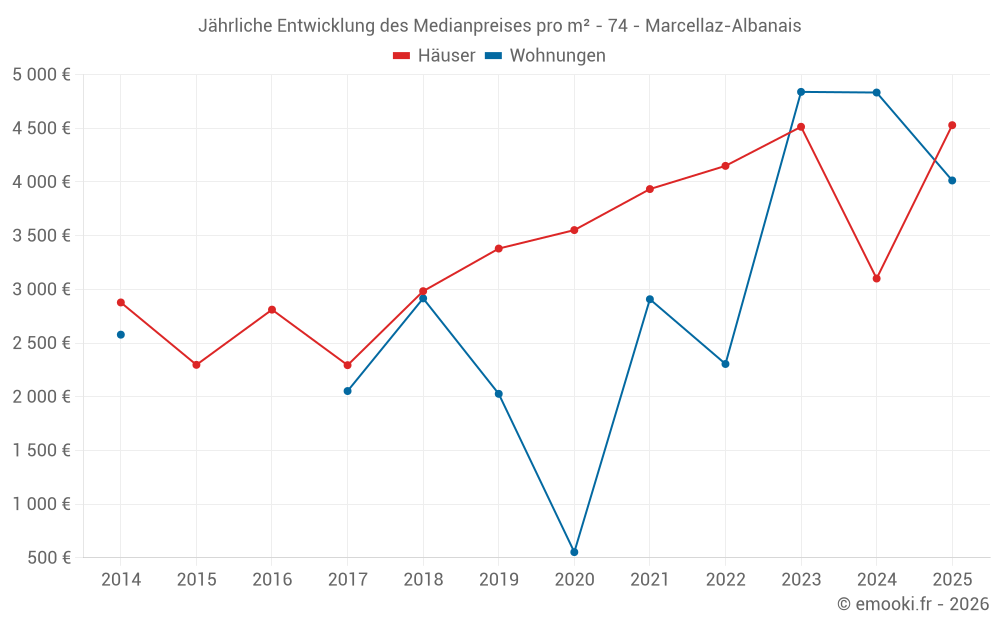 Der Durchschnittspreis auf den 29 Hausgeschäften der letzten 24 Monate in der Gemeinde Marcellaz-Albanais betrug 3 868 € pro Quadratmeter für einen mittleren Immobilienwert von 415 000 €. Über diesen Zeitraum hinweg lagen 60% der Transaktionen zwischen 2 836 und 4 739 € pro Quadratmeter (vom 2. bis zum 8. Dezil).