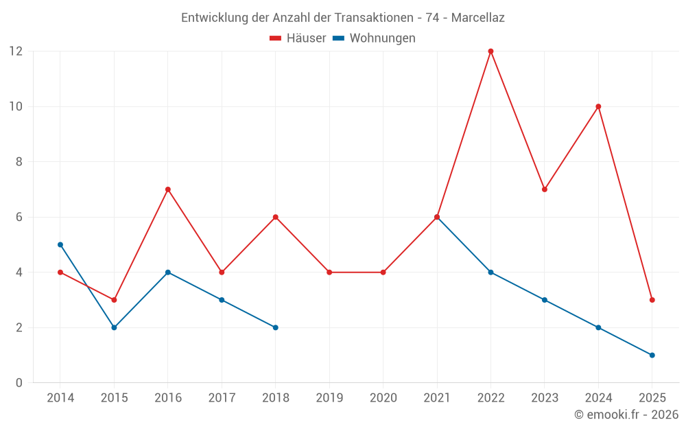 Der Durchschnittspreis auf den 17 Hausgeschäften der letzten 24 Monate in der Gemeinde Marcellaz betrug 4 938 € pro Quadratmeter für einen mittleren Immobilienwert von 512 900 €. Über diesen Zeitraum hinweg lagen 60% der Transaktionen zwischen 3 631 und 5 546 € pro Quadratmeter (vom 2. bis zum 8. Dezil).