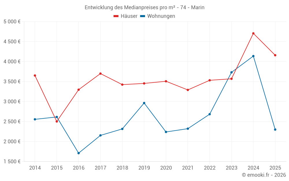 Der Durchschnittspreis auf den 18 Hausgeschäften der letzten 24 Monate in der Gemeinde Marin betrug 4 216 € pro Quadratmeter für einen mittleren Immobilienwert von 428 678 €. Über diesen Zeitraum hinweg lagen 60% der Transaktionen zwischen 2 872 und 5 613 € pro Quadratmeter (vom 2. bis zum 8. Dezil).