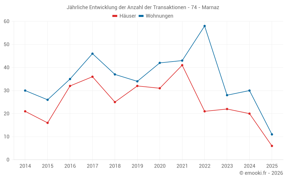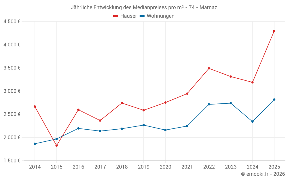 Der Durchschnittspreis auf den 22 Hausgeschäften der letzten 12 Monate in der Gemeinde Marnaz betrug 3 302 € pro Quadratmeter für einen mittleren Immobilienwert von 377 575 €. Über diesen Zeitraum hinweg lagen 60% der Transaktionen zwischen 2 882 und 3 856 € pro Quadratmeter (vom 2. bis zum 8. Dezil).
