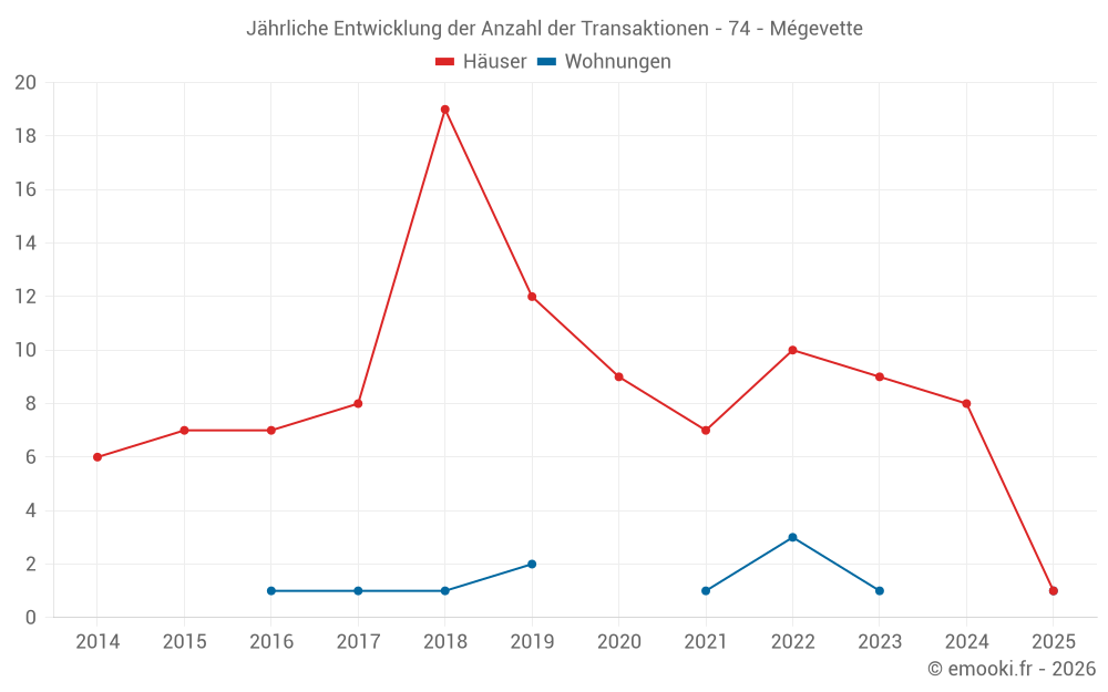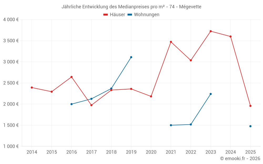 Der Durchschnittspreis auf den 15 Hausgeschäften der letzten 24 Monate in der Gemeinde Mégevette betrug 3 636 € pro Quadratmeter für einen mittleren Immobilienwert von 236 550 €. Über diesen Zeitraum hinweg lagen 60% der Transaktionen zwischen 2 124 und 4 844 € pro Quadratmeter (vom 2. bis zum 8. Dezil).