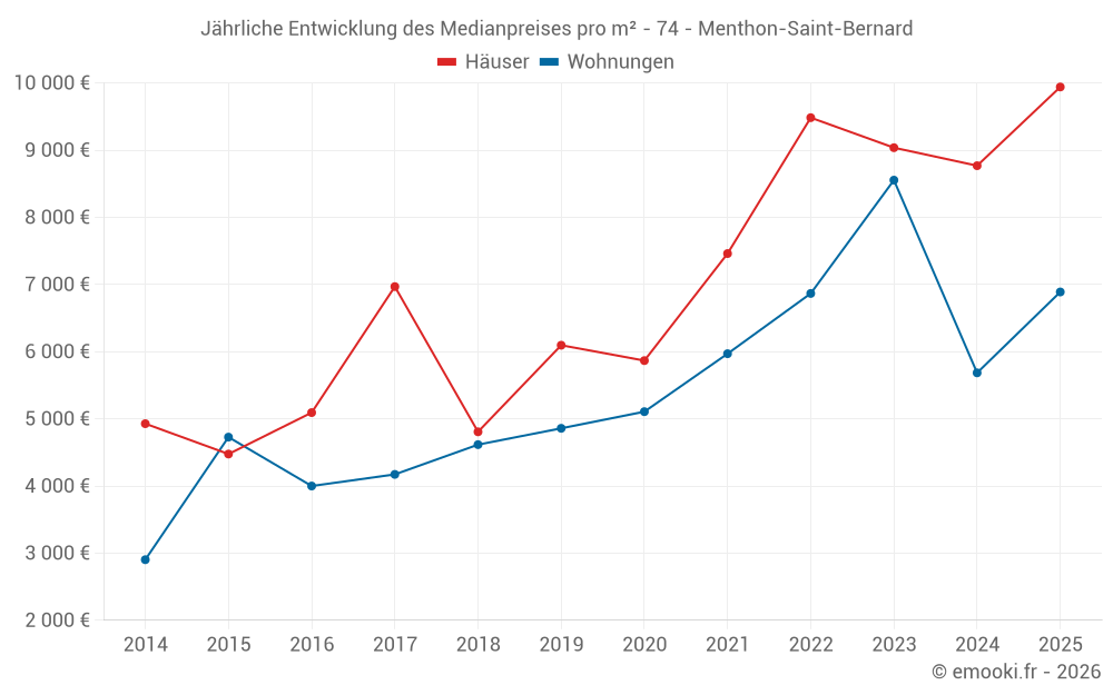 Der Durchschnittspreis auf den 24 Hausgeschäften der letzten 24 Monate in der Gemeinde Menthon-Saint-Bernard betrug 9 458 € pro Quadratmeter für einen mittleren Immobilienwert von 1 322 358 €. Über diesen Zeitraum hinweg lagen 60% der Transaktionen zwischen 6 214 und 14 235 € pro Quadratmeter (vom 2. bis zum 8. Dezil).