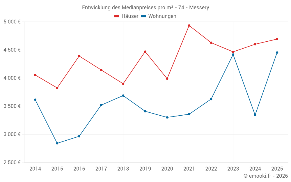 Der Durchschnittspreis auf den 26 Hausgeschäften der letzten 12 Monate in der Gemeinde Messery betrug 4 692 € pro Quadratmeter für einen mittleren Immobilienwert von 415 100 €. Über diesen Zeitraum hinweg lagen 60% der Transaktionen zwischen 3 525 und 6 190 € pro Quadratmeter (vom 2. bis zum 8. Dezil).