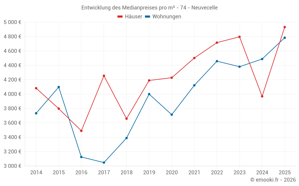 Der Durchschnittspreis auf den 19 Wohnungstransaktionen der letzten 12 Monate in der Gemeinde Neuvecelle betrug 4 523 € pro Quadratmeter für einen mittleren Immobilienwert von 265 000 €. Über diesen Zeitraum hinweg lagen 60% der Transaktionen zwischen 3 990 und 5 120 € pro Quadratmeter (vom 2. bis zum 8. Dezil).