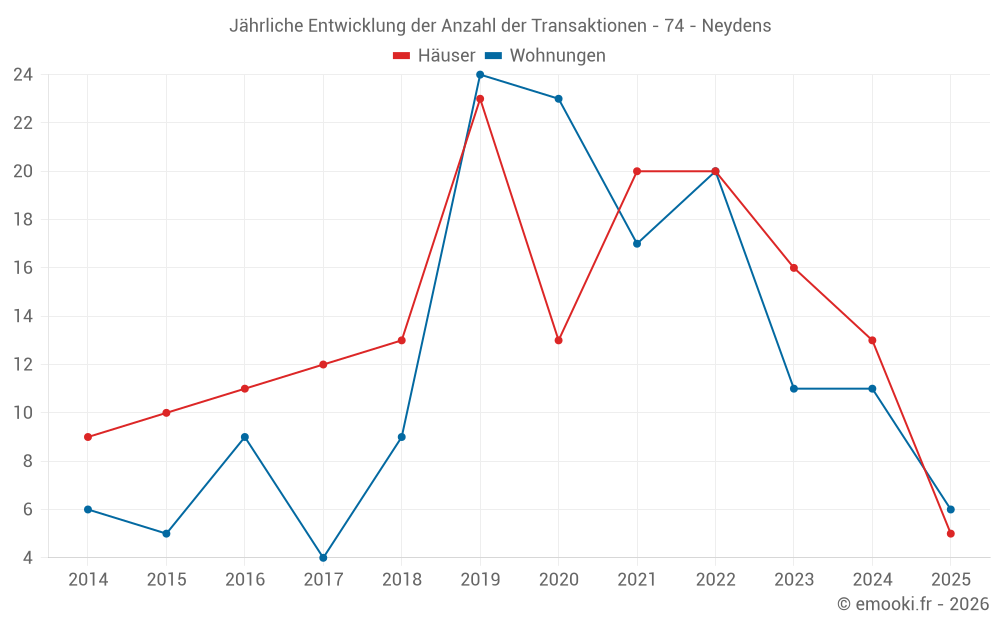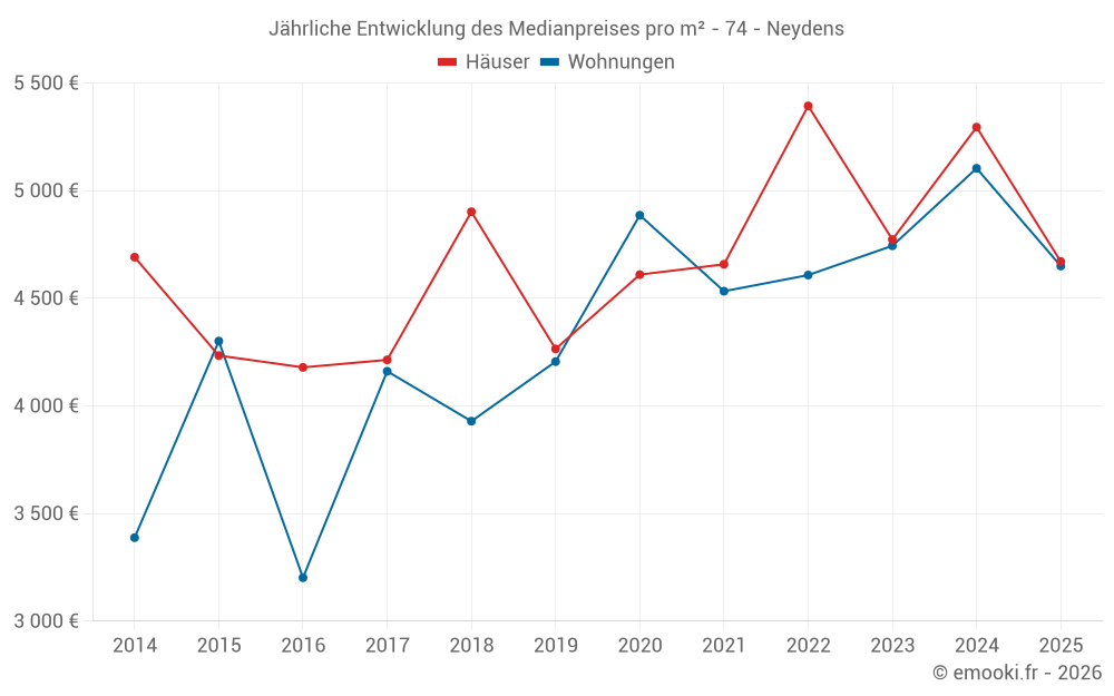 Der Durchschnittspreis auf den 25 Hausgeschäften der letzten 24 Monate in der Gemeinde Neydens betrug 5 171 € pro Quadratmeter für einen mittleren Immobilienwert von 650 000 €. Über diesen Zeitraum hinweg lagen 60% der Transaktionen zwischen 4 066 und 6 284 € pro Quadratmeter (vom 2. bis zum 8. Dezil).