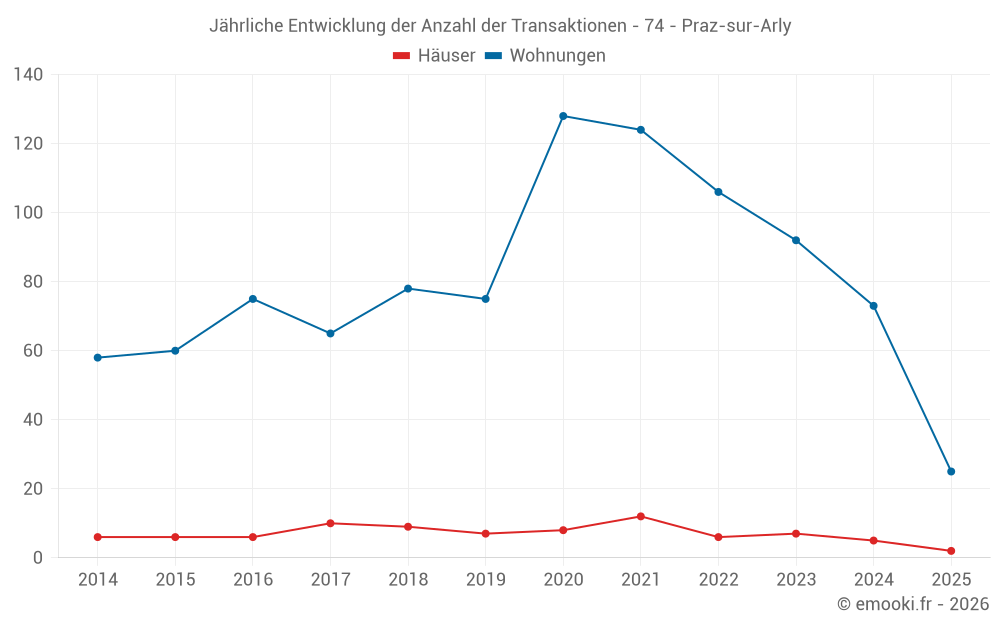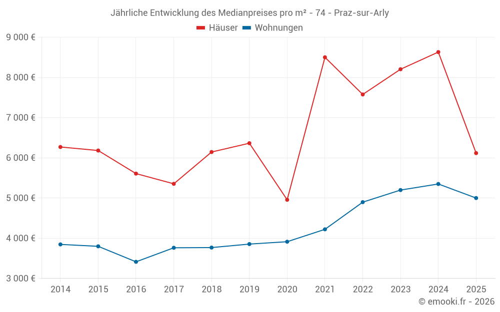 Der Durchschnittspreis auf den 25 Wohnungstransaktionen der letzten 6 Monate in der Gemeinde Praz-sur-Arly betrug 5 000 € pro Quadratmeter für einen mittleren Immobilienwert von 151 900 €. Über diesen Zeitraum hinweg lagen 60% der Transaktionen zwischen 4 496 und 5 997 € pro Quadratmeter (vom 2. bis zum 8. Dezil).