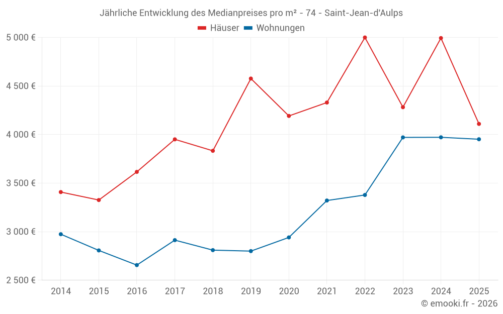 Der Durchschnittspreis auf den 19 Hausgeschäften der letzten 12 Monate in der Gemeinde Saint-Jean-d'Aulps betrug 4 589 € pro Quadratmeter für einen mittleren Immobilienwert von 445 000 €. Über diesen Zeitraum hinweg lagen 60% der Transaktionen zwischen 3 278 und 6 239 € pro Quadratmeter (vom 2. bis zum 8. Dezil).
