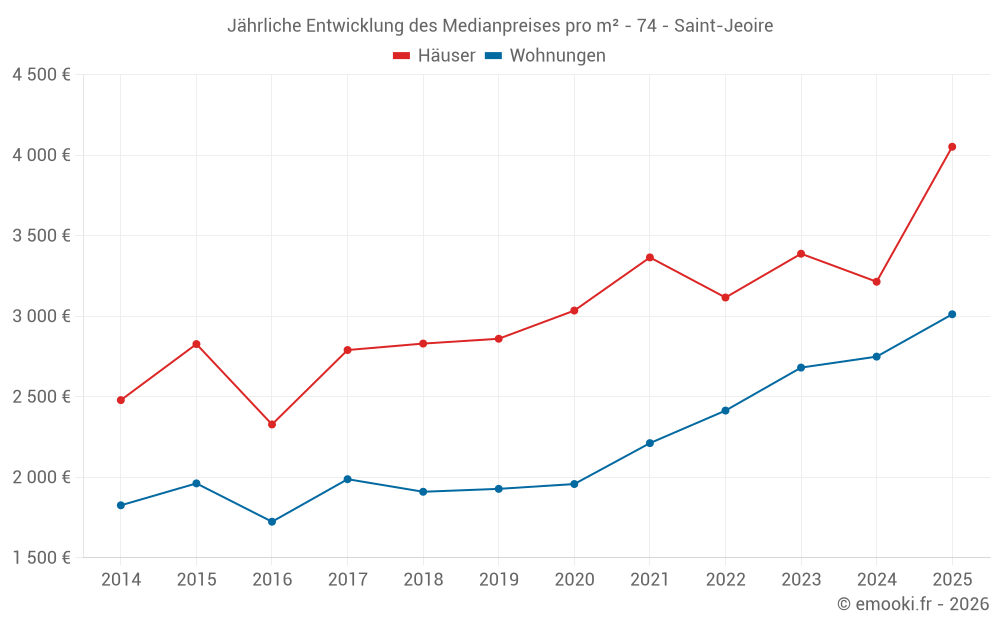 Der Durchschnittspreis auf den 18 Hausgeschäften der letzten 12 Monate in der Gemeinde Saint-Jeoire betrug 3 788 € pro Quadratmeter für einen mittleren Immobilienwert von 319 450 €. Über diesen Zeitraum hinweg lagen 60% der Transaktionen zwischen 2 184 und 5 214 € pro Quadratmeter (vom 2. bis zum 8. Dezil).