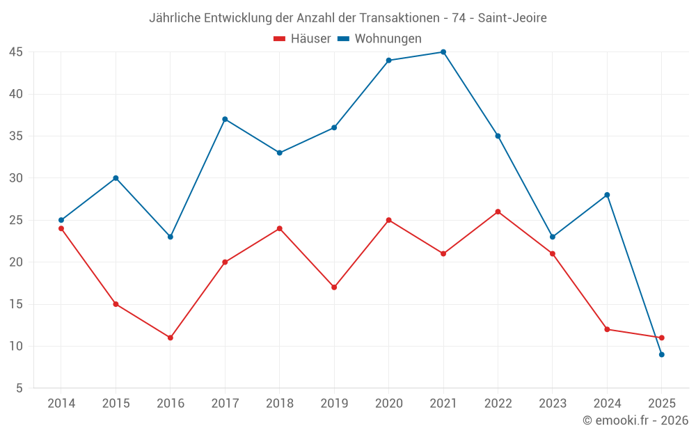 Der Durchschnittspreis auf den 20 Wohnungstransaktionen der letzten 12 Monate in der Gemeinde Saint-Jeoire betrug 2 986 € pro Quadratmeter für einen mittleren Immobilienwert von 84 050 €. Über diesen Zeitraum hinweg lagen 60% der Transaktionen zwischen 2 550 und 3 542 € pro Quadratmeter (vom 2. bis zum 8. Dezil).