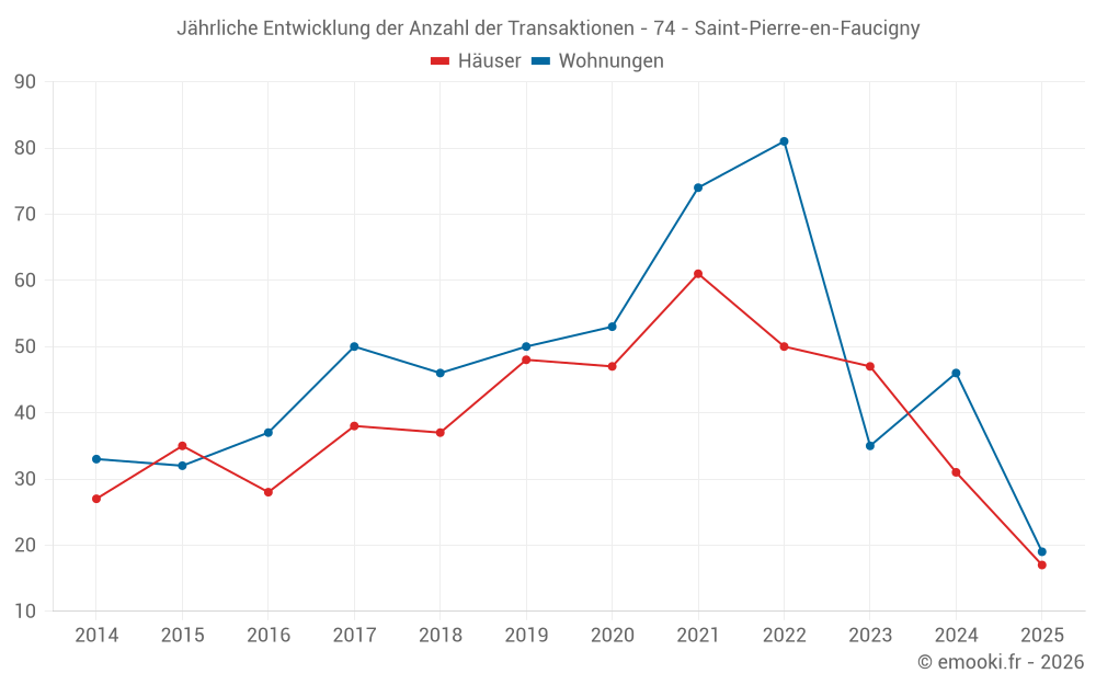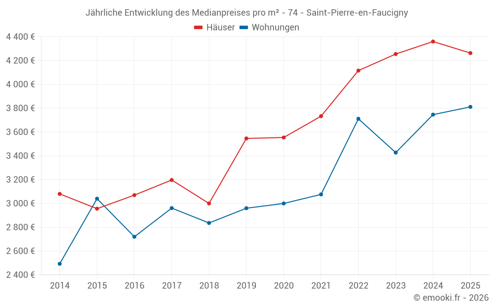 Der Durchschnittspreis auf den 35 Hausgeschäften der letzten 12 Monate in der Gemeinde Saint-Pierre-en-Faucigny betrug 4 353 € pro Quadratmeter für einen mittleren Immobilienwert von 424 540 €. Über diesen Zeitraum hinweg lagen 60% der Transaktionen zwischen 3 813 und 5 129 € pro Quadratmeter (vom 2. bis zum 8. Dezil).