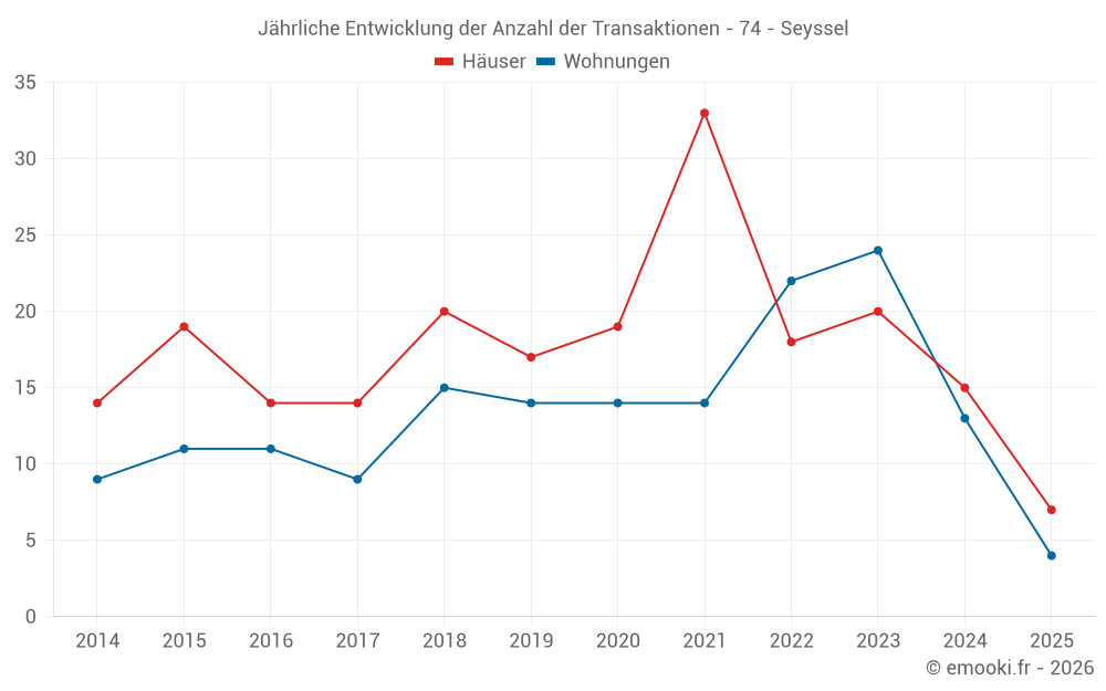 Der Durchschnittspreis auf den 18 Hausgeschäften der letzten 12 Monate in der Gemeinde Seyssel betrug 3 178 € pro Quadratmeter für einen mittleren Immobilienwert von 320 261 €. Über diesen Zeitraum hinweg lagen 60% der Transaktionen zwischen 1 332 und 3 823 € pro Quadratmeter (vom 2. bis zum 8. Dezil).