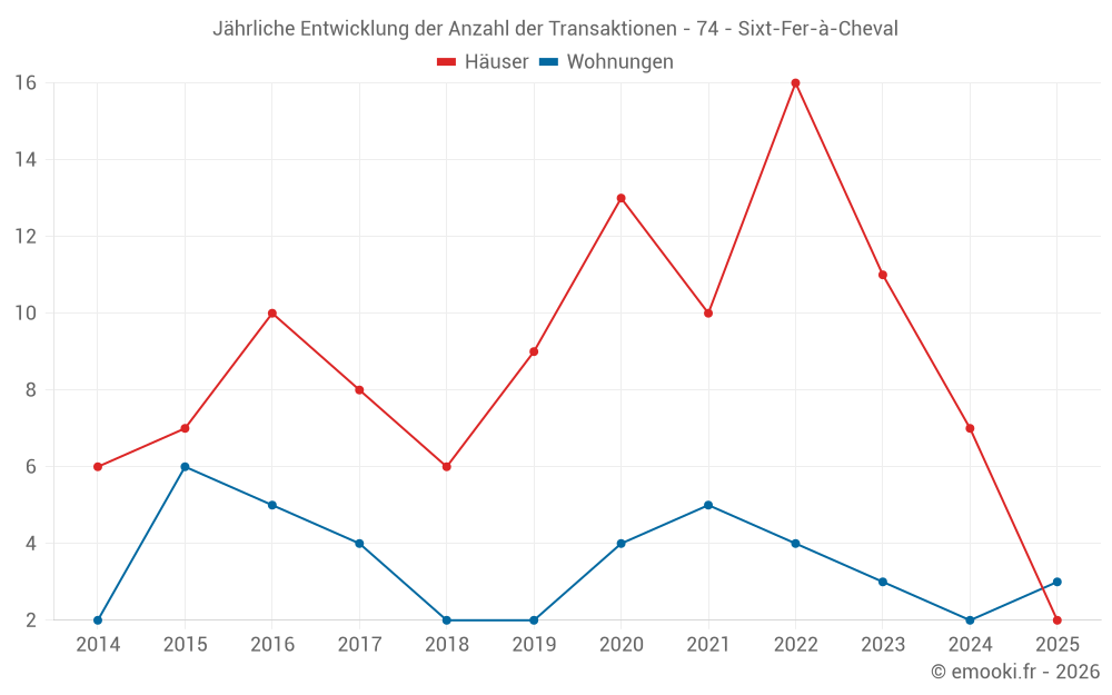 Der Durchschnittspreis auf den 14 Hausgeschäften der letzten 24 Monate in der Gemeinde Sixt-Fer-à-Cheval betrug 4 638 € pro Quadratmeter für einen mittleren Immobilienwert von 360 000 €. Über diesen Zeitraum hinweg lagen 60% der Transaktionen zwischen 2 895 und 7 921 € pro Quadratmeter (vom 2. bis zum 8. Dezil).