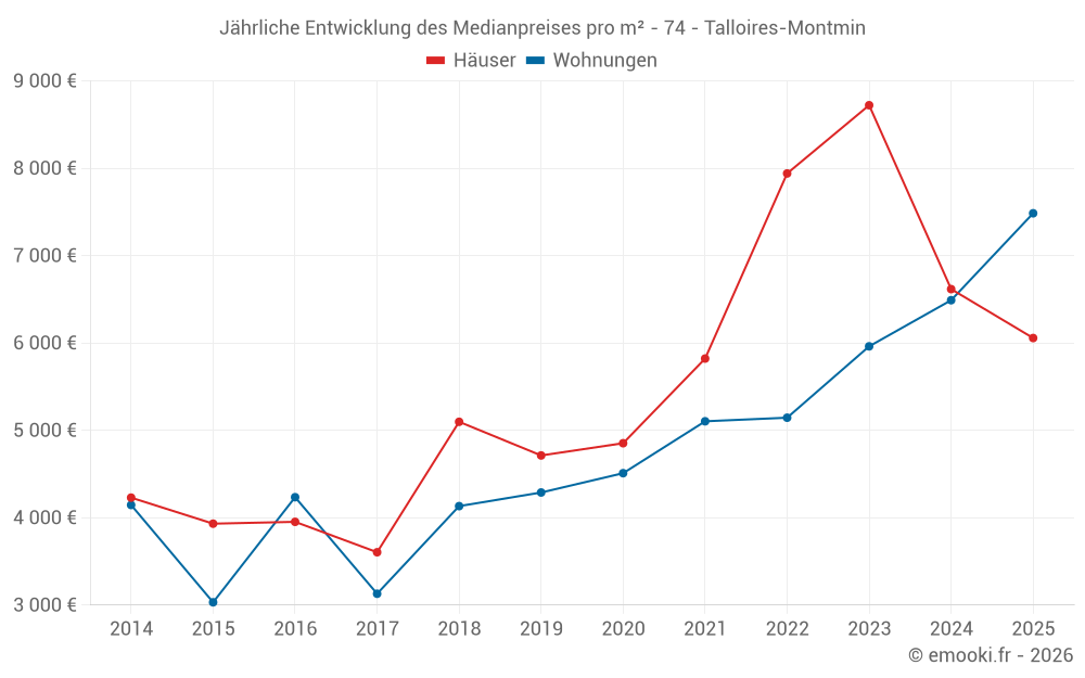 Der Durchschnittspreis auf den 30 Wohnungstransaktionen der letzten 24 Monate in der Gemeinde Talloires-Montmin betrug 6 250 € pro Quadratmeter für einen mittleren Immobilienwert von 332 398 €. Über diesen Zeitraum hinweg lagen 60% der Transaktionen zwischen 3 826 und 7 715 € pro Quadratmeter (vom 2. bis zum 8. Dezil).