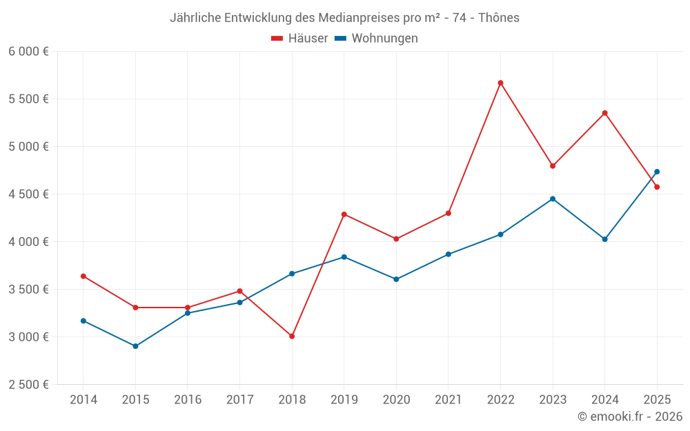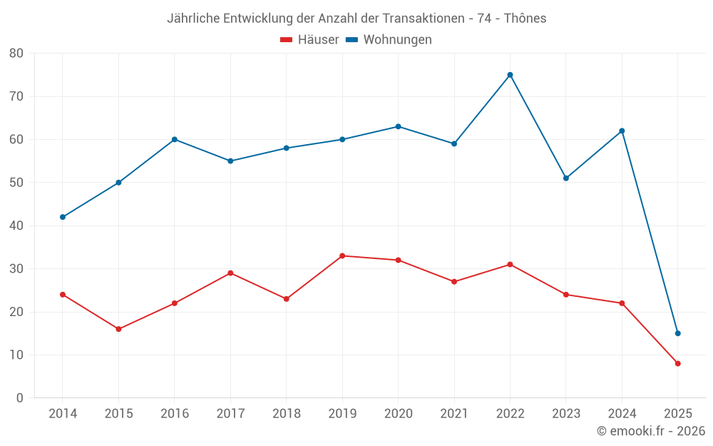 Der Durchschnittspreis auf den 18 Hausgeschäften der letzten 12 Monate in der Gemeinde Thônes betrug 4 910 € pro Quadratmeter für einen mittleren Immobilienwert von 443 300 €. Über diesen Zeitraum hinweg lagen 60% der Transaktionen zwischen 3 770 und 7 743 € pro Quadratmeter (vom 2. bis zum 8. Dezil).