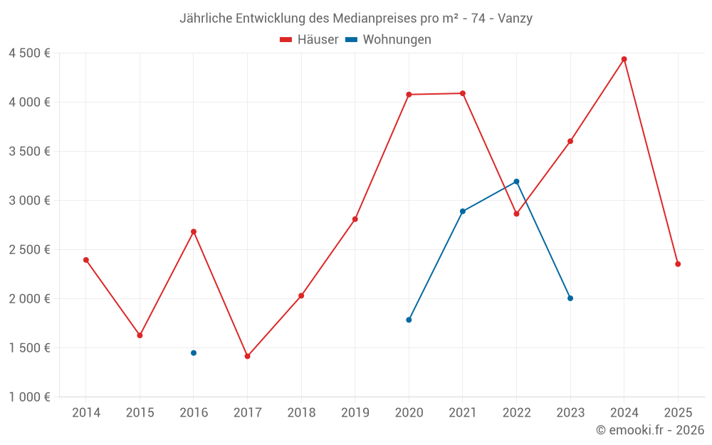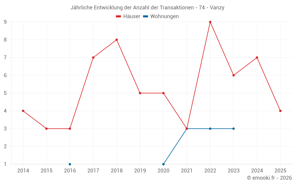 Der Durchschnittspreis auf den 16 Hausgeschäften der letzten 24 Monate in der Gemeinde Vanzy betrug 3 604 € pro Quadratmeter für einen mittleren Immobilienwert von 303 025 €. Über diesen Zeitraum hinweg lagen 60% der Transaktionen zwischen 2 220 und 4 681 € pro Quadratmeter (vom 2. bis zum 8. Dezil).