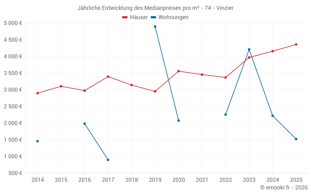 Der Durchschnittspreis auf den 20 Hausgeschäften der letzten 24 Monate in der Gemeinde Vinzier betrug 4 238 € pro Quadratmeter für einen mittleren Immobilienwert von 417 500 €. Über diesen Zeitraum hinweg lagen 60% der Transaktionen zwischen 3 349 und 5 250 € pro Quadratmeter (vom 2. bis zum 8. Dezil).