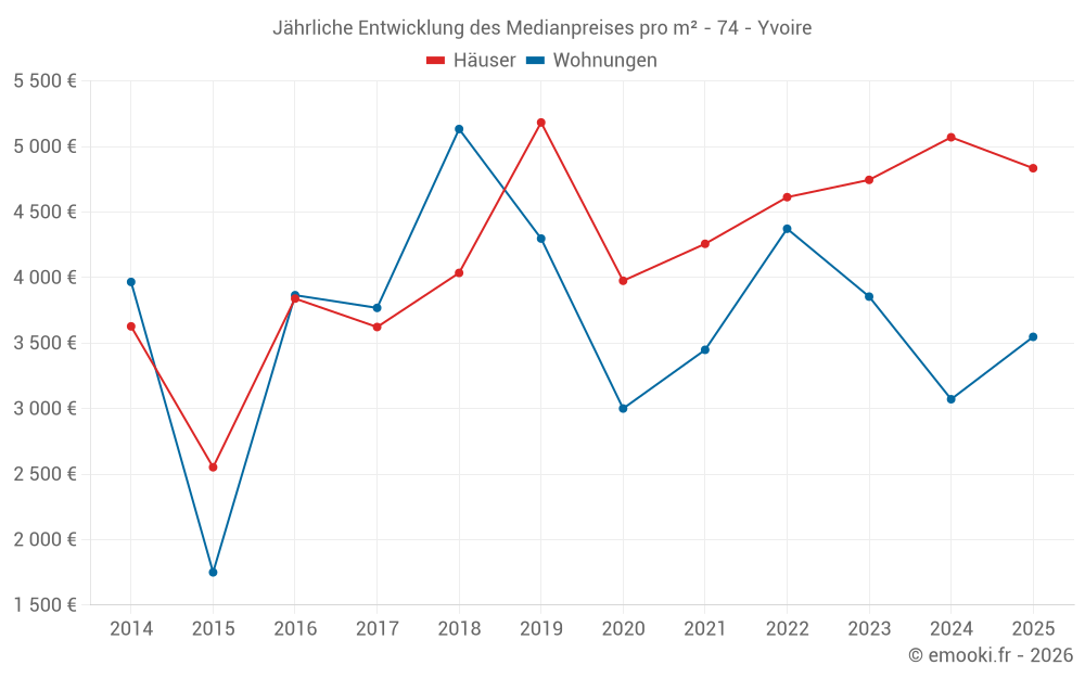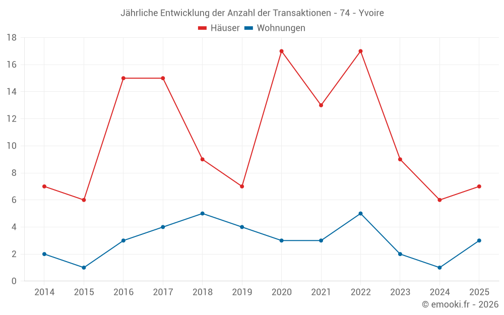 Der Durchschnittspreis auf den 18 Hausgeschäften der letzten 24 Monate in der Gemeinde Yvoire betrug 4 818 € pro Quadratmeter für einen mittleren Immobilienwert von 582 500 €. Über diesen Zeitraum hinweg lagen 60% der Transaktionen zwischen 3 509 und 7 760 € pro Quadratmeter (vom 2. bis zum 8. Dezil).
