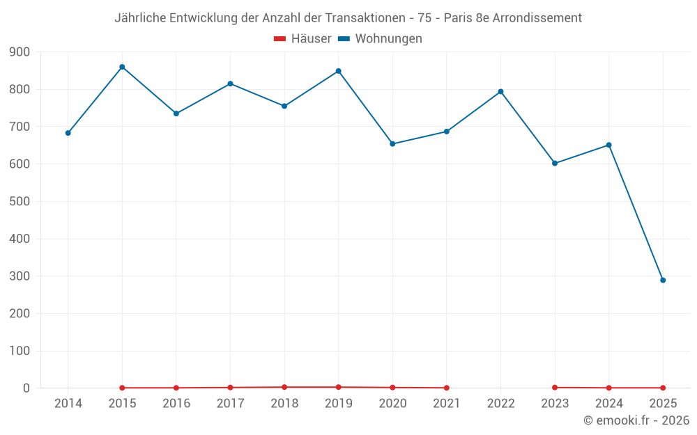Der Durchschnittspreis auf den 109 Wohnungstransaktionen der letzten 3 Monate in der Gemeinde Paris 8e Arrondissement betrug 12 177 € pro Quadratmeter für einen mittleren Immobilienwert von 800 000 €. Über diesen Zeitraum hinweg lagen 60% der Transaktionen zwischen 9 978 und 15 927 € pro Quadratmeter (vom 2. bis zum 8. Dezil).