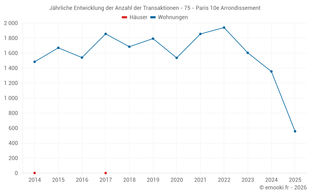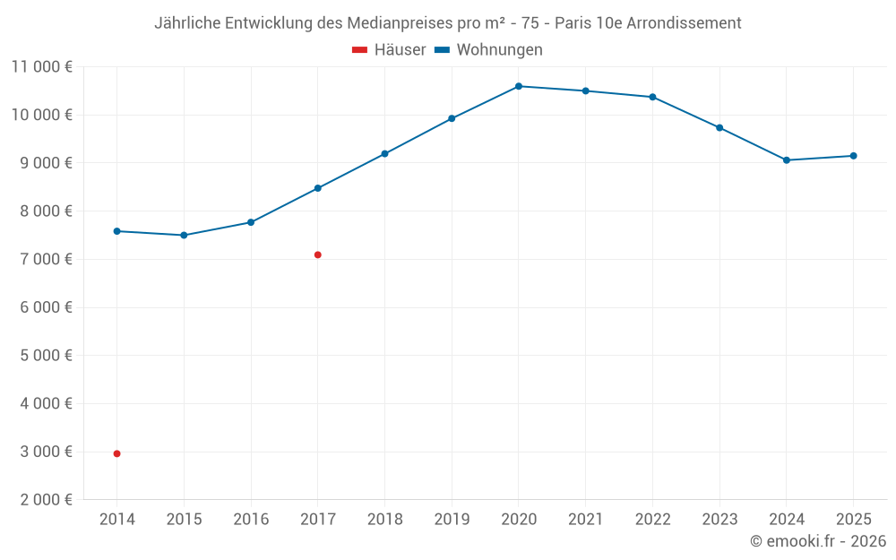 Der Durchschnittspreis auf den 165 Wohnungstransaktionen der letzten 3 Monate in der Gemeinde Paris 10e Arrondissement betrug 8 883 € pro Quadratmeter für einen mittleren Immobilienwert von 287 000 €. Über diesen Zeitraum hinweg lagen 60% der Transaktionen zwischen 6 925 und 10 773 € pro Quadratmeter (vom 2. bis zum 8. Dezil).