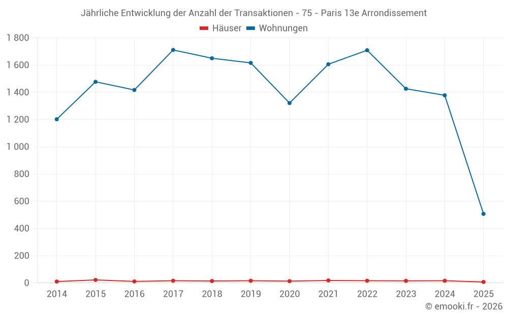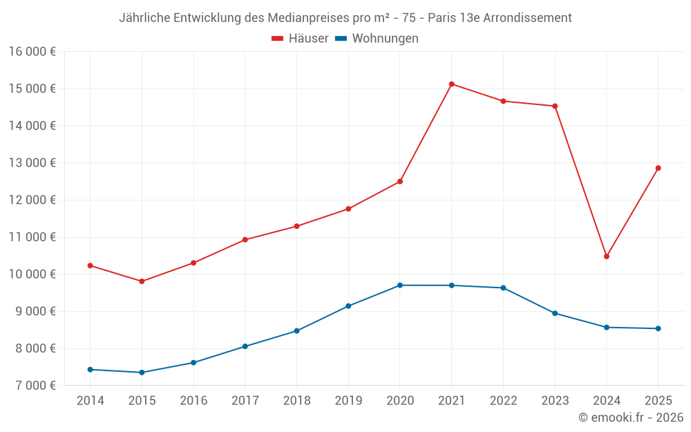 Der Durchschnittspreis auf den 18 Hausgeschäften der letzten 12 Monate in der Gemeinde Paris 13e Arrondissement betrug 11 958 € pro Quadratmeter für einen mittleren Immobilienwert von 1 045 000 €. Über diesen Zeitraum hinweg lagen 60% der Transaktionen zwischen 8 978 und 16 840 € pro Quadratmeter (vom 2. bis zum 8. Dezil).