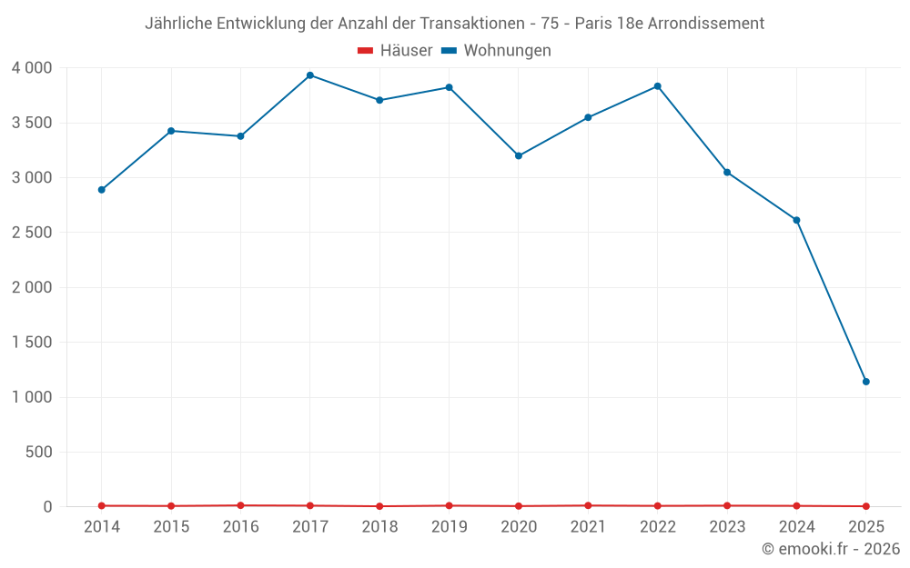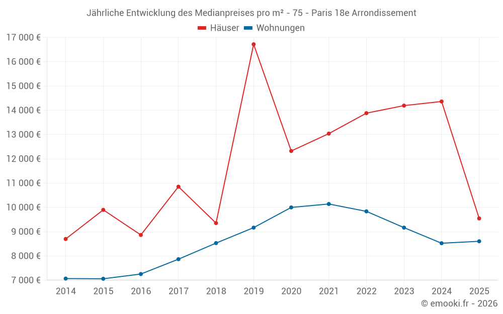 Der Durchschnittspreis auf den 25 Hausgeschäften der letzten 24 Monate in der Gemeinde Paris 18e Arrondissement betrug 12 187 € pro Quadratmeter für einen mittleren Immobilienwert von 1 571 438 €. Über diesen Zeitraum hinweg lagen 60% der Transaktionen zwischen 6 054 und 19 672 € pro Quadratmeter (vom 2. bis zum 8. Dezil).