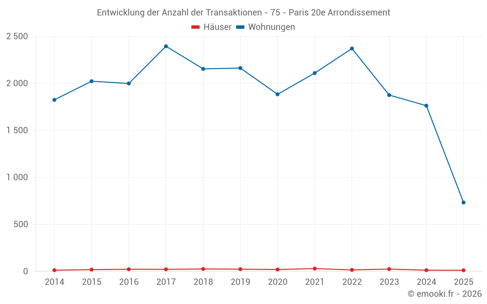 Der Durchschnittspreis auf den 18 Hausgeschäften der letzten 12 Monate in der Gemeinde Paris 20e Arrondissement betrug 10 046 € pro Quadratmeter für einen mittleren Immobilienwert von 1 070 650 €. Über diesen Zeitraum hinweg lagen 60% der Transaktionen zwischen 7 925 und 11 803 € pro Quadratmeter (vom 2. bis zum 8. Dezil).