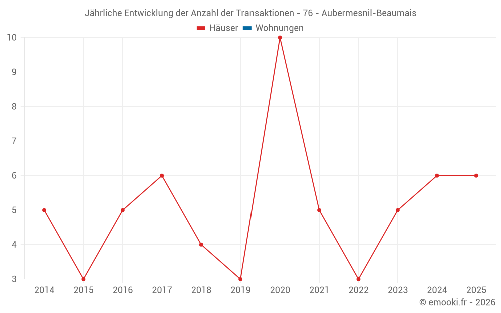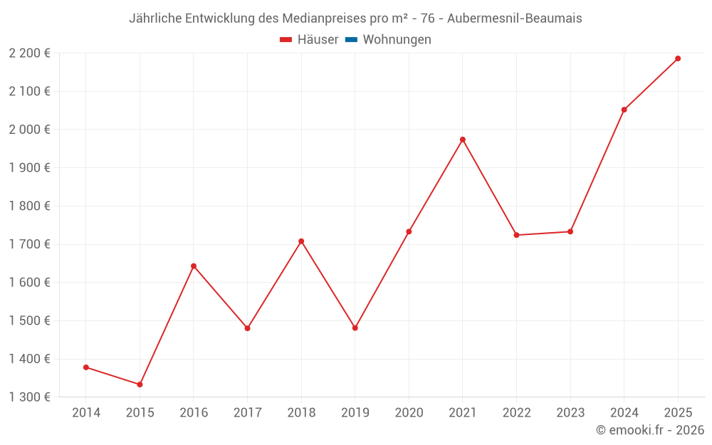 Der Durchschnittspreis auf den 14 Hausgeschäften der letzten 24 Monate in der Gemeinde Aubermesnil-Beaumais betrug 2 174 € pro Quadratmeter für einen mittleren Immobilienwert von 200 375 €. Über diesen Zeitraum hinweg lagen 60% der Transaktionen zwischen 1 143 und 2 538 € pro Quadratmeter (vom 2. bis zum 8. Dezil).