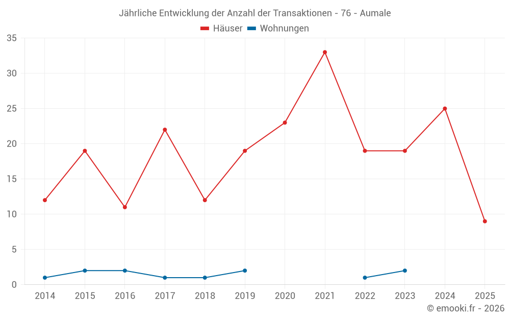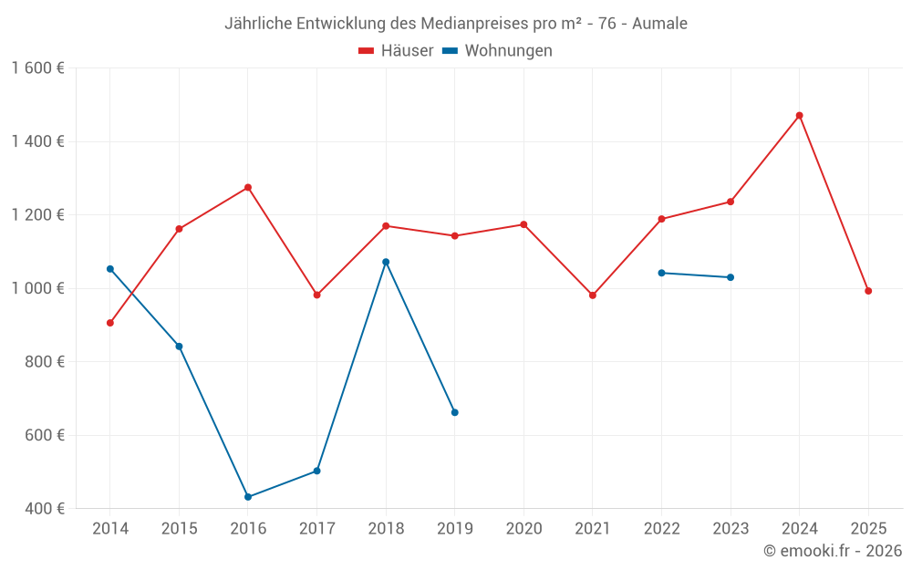 Der Durchschnittspreis auf den 26 Hausgeschäften der letzten 12 Monate in der Gemeinde Aumale betrug 1 392 € pro Quadratmeter für einen mittleren Immobilienwert von 95 000 €. Über diesen Zeitraum hinweg lagen 60% der Transaktionen zwischen 941 und 1 702 € pro Quadratmeter (vom 2. bis zum 8. Dezil).