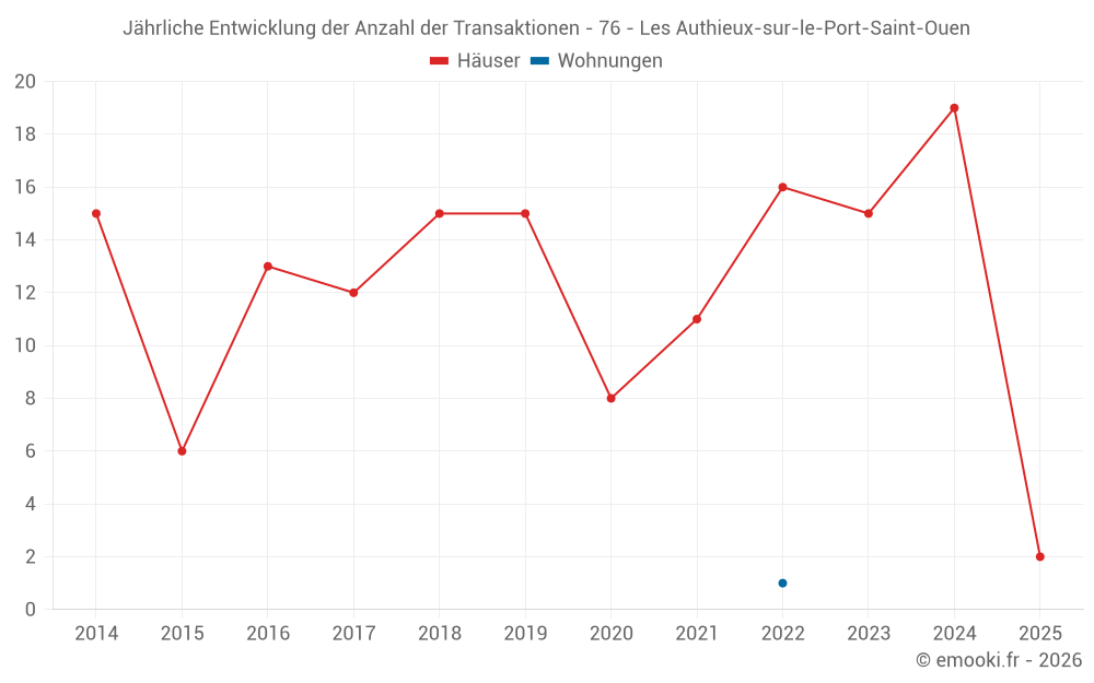 Der Durchschnittspreis auf den 29 Hausgeschäften der letzten 24 Monate in der Gemeinde Les Authieux-sur-le-Port-Saint-Ouen betrug 2 411 € pro Quadratmeter für einen mittleren Immobilienwert von 232 000 €. Über diesen Zeitraum hinweg lagen 60% der Transaktionen zwischen 1 737 und 2 685 € pro Quadratmeter (vom 2. bis zum 8. Dezil).