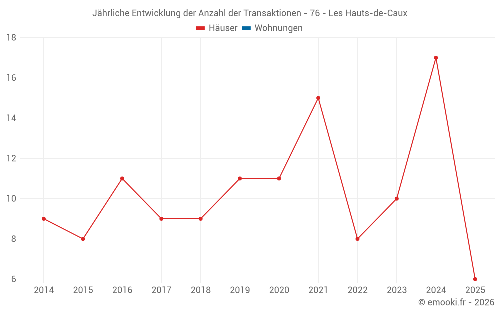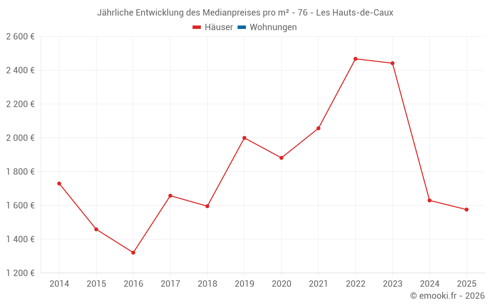 Der Durchschnittspreis auf den 29 Hausgeschäften der letzten 24 Monate in der Gemeinde Les Hauts-de-Caux betrug 1 706 € pro Quadratmeter für einen mittleren Immobilienwert von 177 000 €. Über diesen Zeitraum hinweg lagen 60% der Transaktionen zwischen 1 503 und 2 424 € pro Quadratmeter (vom 2. bis zum 8. Dezil).