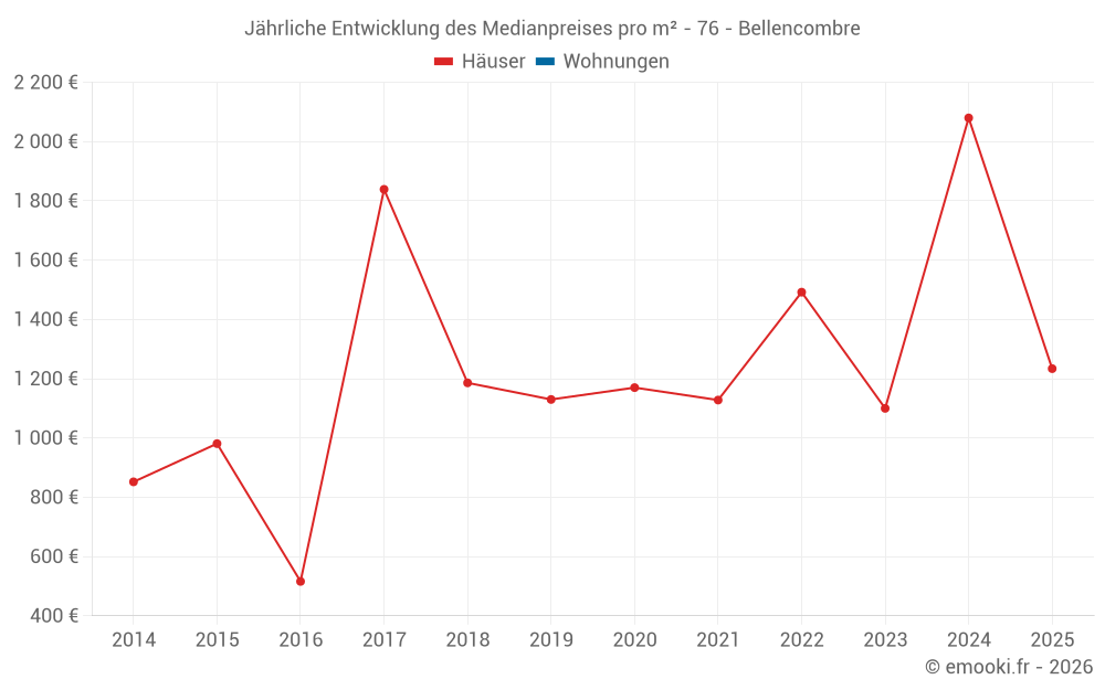 Der Durchschnittspreis auf den 14 Hausgeschäften der letzten 24 Monate in der Gemeinde Bellencombre betrug 1 412 € pro Quadratmeter für einen mittleren Immobilienwert von 123 000 €. Über diesen Zeitraum hinweg lagen 60% der Transaktionen zwischen 1 072 und 2 177 € pro Quadratmeter (vom 2. bis zum 8. Dezil).