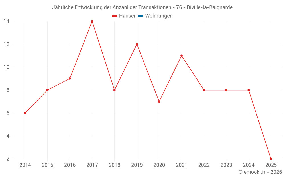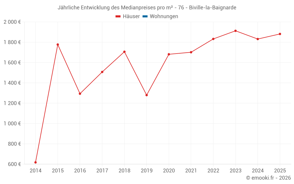 Der Durchschnittspreis auf den 16 Hausgeschäften der letzten 24 Monate in der Gemeinde Biville-la-Baignarde betrug 1 866 € pro Quadratmeter für einen mittleren Immobilienwert von 184 517 €. Über diesen Zeitraum hinweg lagen 60% der Transaktionen zwischen 1 513 und 1 984 € pro Quadratmeter (vom 2. bis zum 8. Dezil).