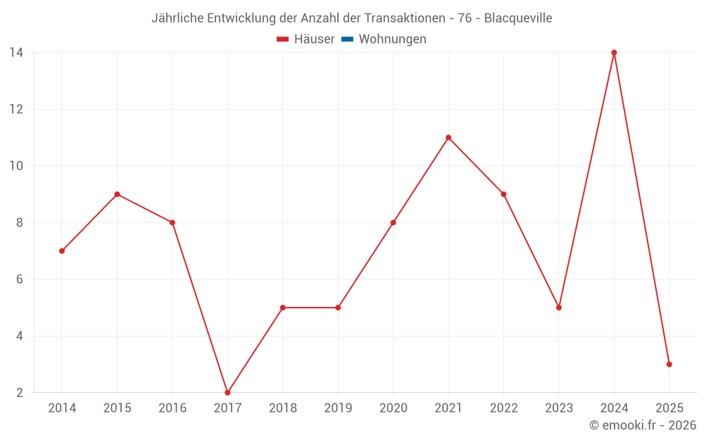 Der Durchschnittspreis auf den 20 Hausgeschäften der letzten 24 Monate in der Gemeinde Blacqueville betrug 1 766 € pro Quadratmeter für einen mittleren Immobilienwert von 188 150 €. Über diesen Zeitraum hinweg lagen 60% der Transaktionen zwischen 895 und 2 190 € pro Quadratmeter (vom 2. bis zum 8. Dezil).