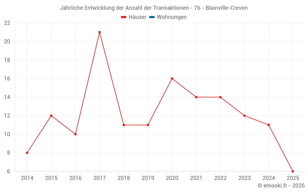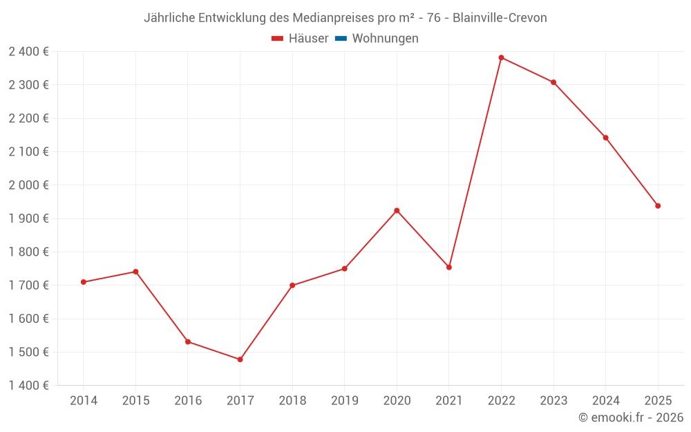Der Durchschnittspreis auf den 24 Hausgeschäften der letzten 24 Monate in der Gemeinde Blainville-Crevon betrug 2 151 € pro Quadratmeter für einen mittleren Immobilienwert von 195 675 €. Über diesen Zeitraum hinweg lagen 60% der Transaktionen zwischen 1 323 und 2 239 € pro Quadratmeter (vom 2. bis zum 8. Dezil).