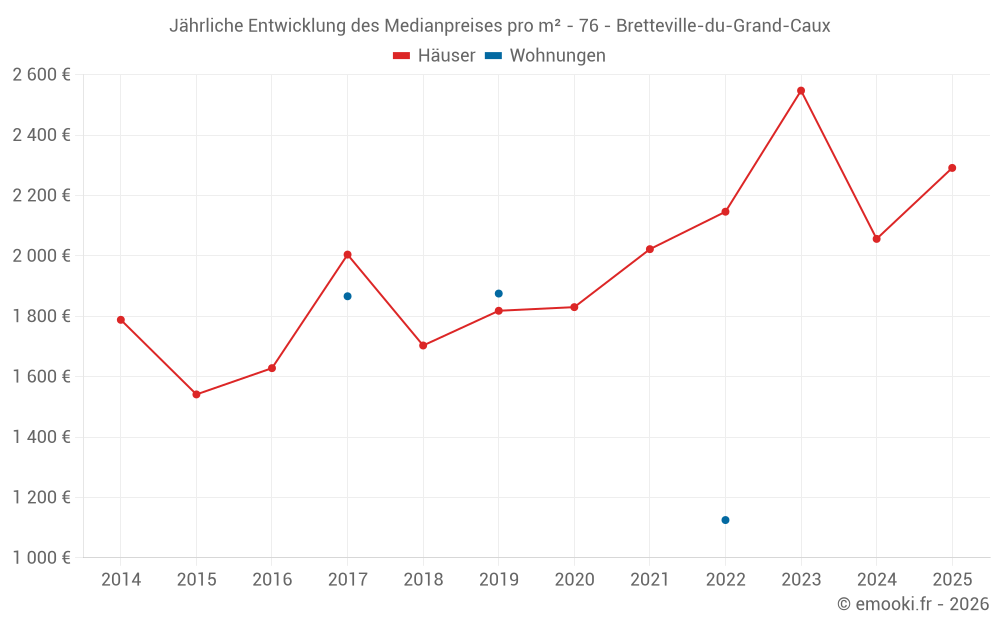 Der Durchschnittspreis auf den 16 Hausgeschäften der letzten 12 Monate in der Gemeinde Bretteville-du-Grand-Caux betrug 2 135 € pro Quadratmeter für einen mittleren Immobilienwert von 216 500 €. Über diesen Zeitraum hinweg lagen 60% der Transaktionen zwischen 1 786 und 2 711 € pro Quadratmeter (vom 2. bis zum 8. Dezil).