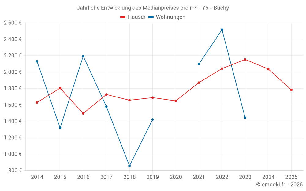 Der Durchschnittspreis auf den 22 Hausgeschäften der letzten 12 Monate in der Gemeinde Buchy betrug 1 895 € pro Quadratmeter für einen mittleren Immobilienwert von 195 500 €. Über diesen Zeitraum hinweg lagen 60% der Transaktionen zwischen 1 377 und 2 865 € pro Quadratmeter (vom 2. bis zum 8. Dezil).