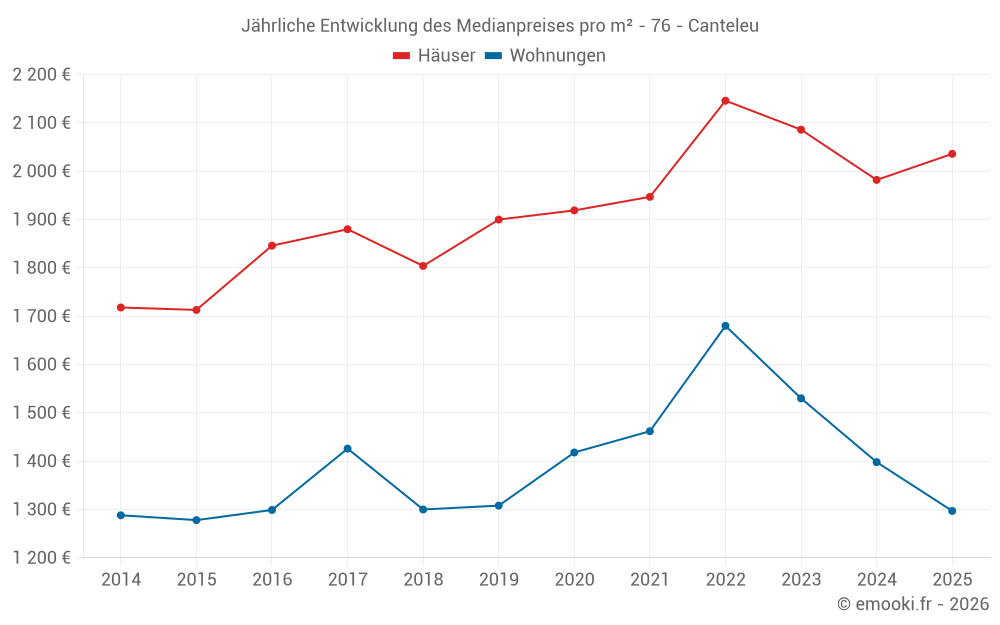 Der Durchschnittspreis auf den 48 Hausgeschäften der letzten 12 Monate in der Gemeinde Canteleu betrug 2 079 € pro Quadratmeter für einen mittleren Immobilienwert von 186 000 €. Über diesen Zeitraum hinweg lagen 60% der Transaktionen zwischen 1 810 und 2 575 € pro Quadratmeter (vom 2. bis zum 8. Dezil).
