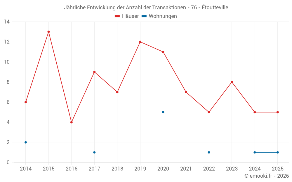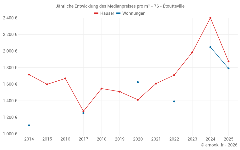 Der Preis pro m² von Häusern ist seit 1 Jahr um 22% gesunken, aber er ist in 8 Jahren um 47% gestiegen.