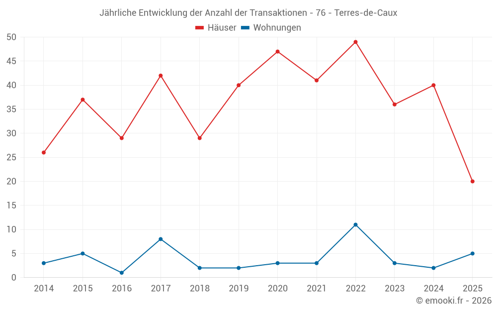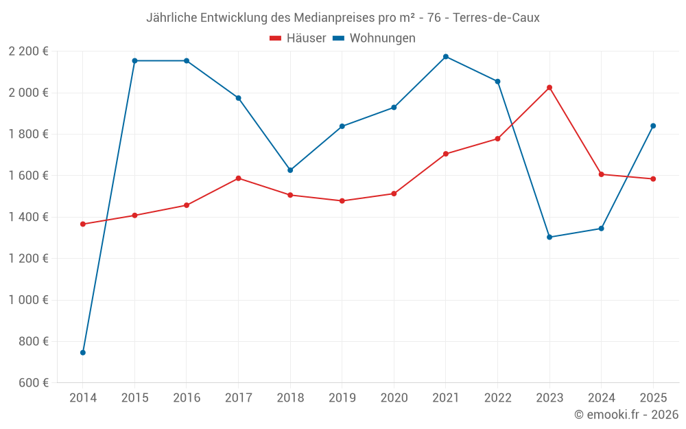 Der Durchschnittspreis auf den 20 Hausgeschäften der letzten 6 Monate in der Gemeinde Terres-de-Caux betrug 1 584 € pro Quadratmeter für einen mittleren Immobilienwert von 158 750 €. Über diesen Zeitraum hinweg lagen 60% der Transaktionen zwischen 1 005 und 2 105 € pro Quadratmeter (vom 2. bis zum 8. Dezil).