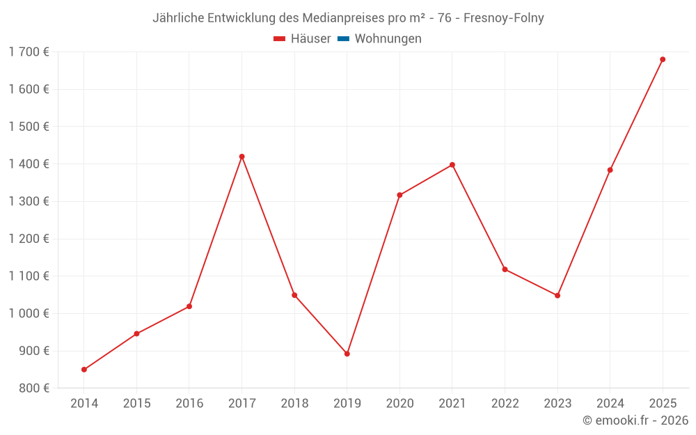 Der Durchschnittspreis auf den 20 Hausgeschäften der letzten 24 Monate in der Gemeinde Fresnoy-Folny betrug 1 422 € pro Quadratmeter für einen mittleren Immobilienwert von 132 450 €. Über diesen Zeitraum hinweg lagen 60% der Transaktionen zwischen 1 130 und 1 884 € pro Quadratmeter (vom 2. bis zum 8. Dezil).