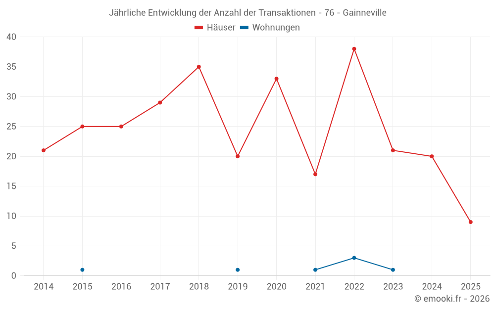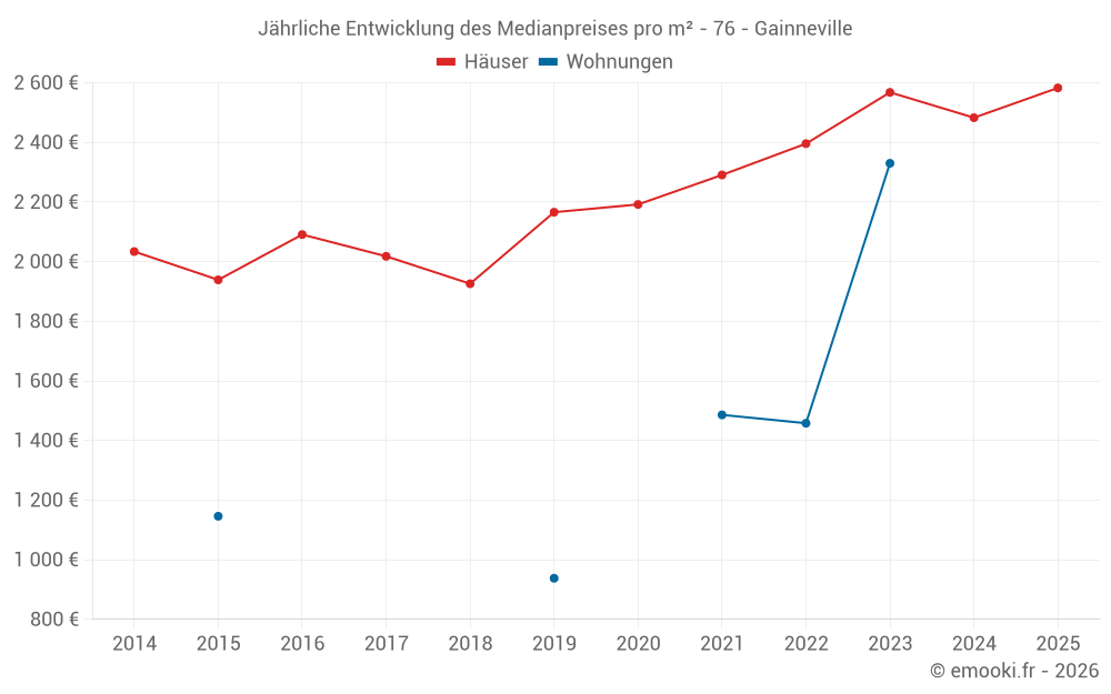 Der Durchschnittspreis auf den 20 Hausgeschäften der letzten 12 Monate in der Gemeinde Gainneville betrug 2 562 € pro Quadratmeter für einen mittleren Immobilienwert von 248 000 €. Über diesen Zeitraum hinweg lagen 60% der Transaktionen zwischen 2 129 und 2 750 € pro Quadratmeter (vom 2. bis zum 8. Dezil).