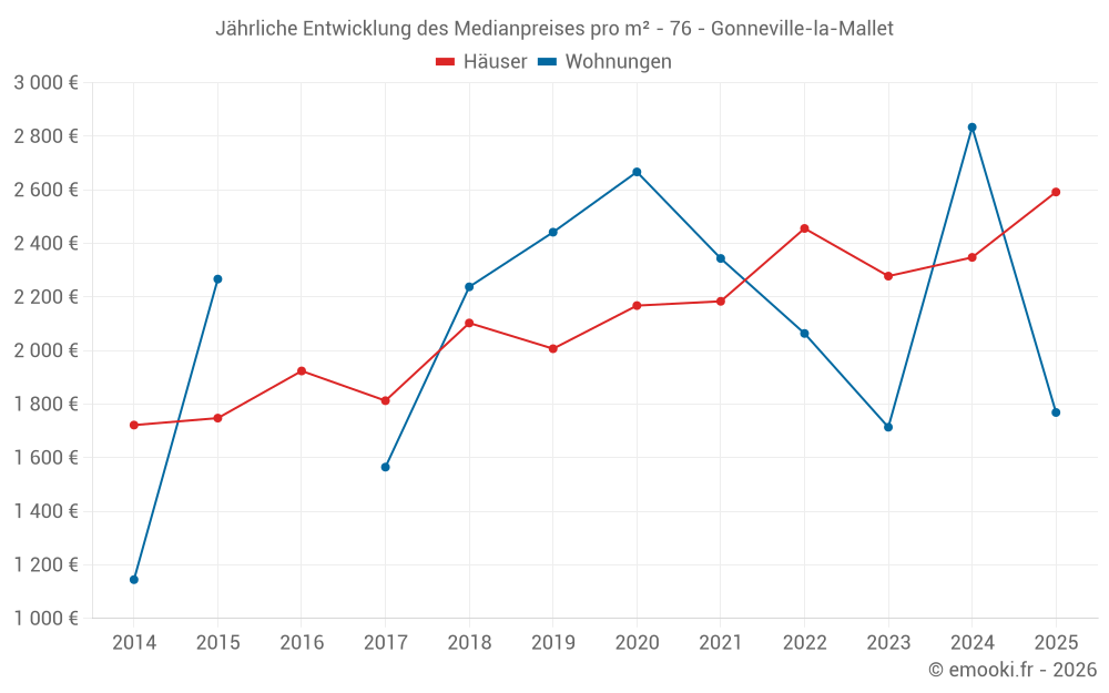 Der Durchschnittspreis auf den 25 Hausgeschäften der letzten 24 Monate in der Gemeinde Gonneville-la-Mallet betrug 2 512 € pro Quadratmeter für einen mittleren Immobilienwert von 232 310 €. Über diesen Zeitraum hinweg lagen 60% der Transaktionen zwischen 1 700 und 2 916 € pro Quadratmeter (vom 2. bis zum 8. Dezil).