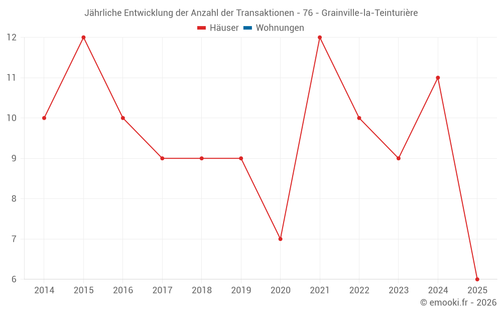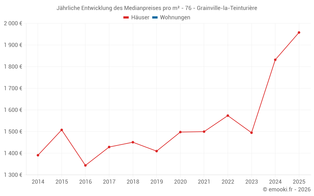 Der Durchschnittspreis auf den 20 Hausgeschäften der letzten 24 Monate in der Gemeinde Grainville-la-Teinturière betrug 1 942 € pro Quadratmeter für einen mittleren Immobilienwert von 161 780 €. Über diesen Zeitraum hinweg lagen 60% der Transaktionen zwischen 1 459 und 2 319 € pro Quadratmeter (vom 2. bis zum 8. Dezil).