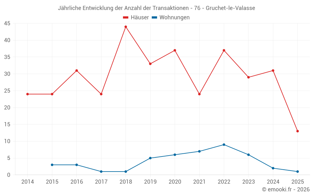Der Durchschnittspreis auf den 27 Hausgeschäften der letzten 12 Monate in der Gemeinde Gruchet-le-Valasse betrug 2 045 € pro Quadratmeter für einen mittleren Immobilienwert von 180 000 €. Über diesen Zeitraum hinweg lagen 60% der Transaktionen zwischen 1 624 und 2 298 € pro Quadratmeter (vom 2. bis zum 8. Dezil).