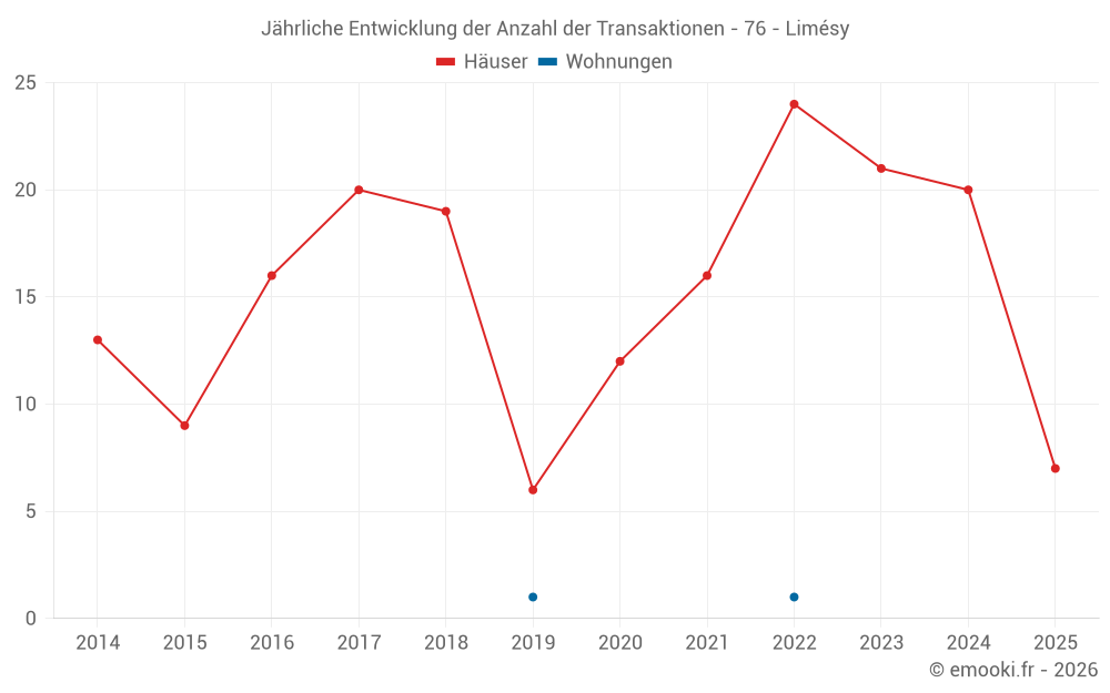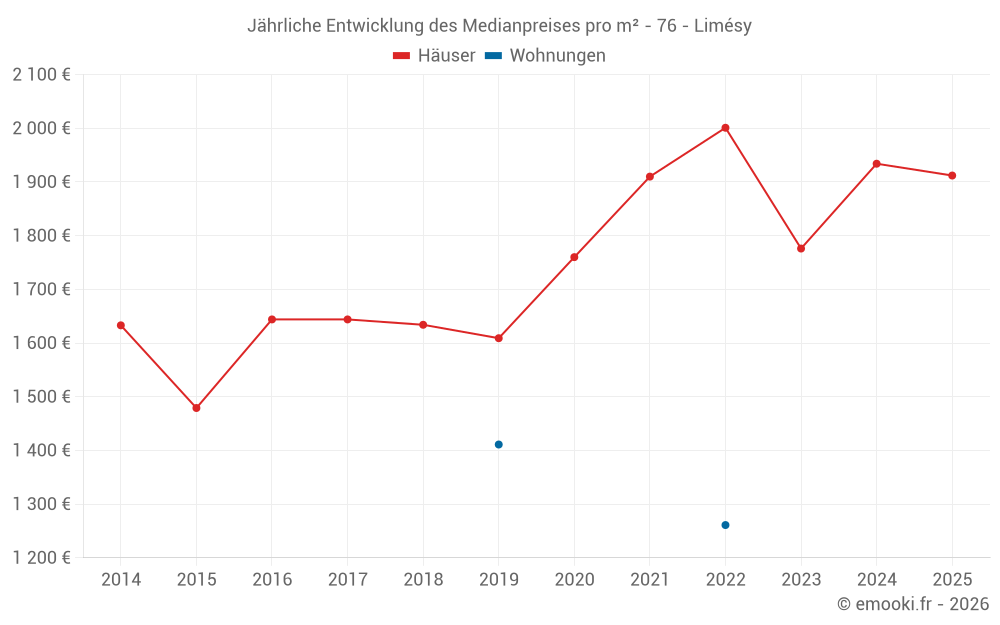 Der Durchschnittspreis auf den 19 Hausgeschäften der letzten 12 Monate in der Gemeinde Limésy betrug 1 911 € pro Quadratmeter für einen mittleren Immobilienwert von 195 181 €. Über diesen Zeitraum hinweg lagen 60% der Transaktionen zwischen 1 464 und 2 134 € pro Quadratmeter (vom 2. bis zum 8. Dezil).
