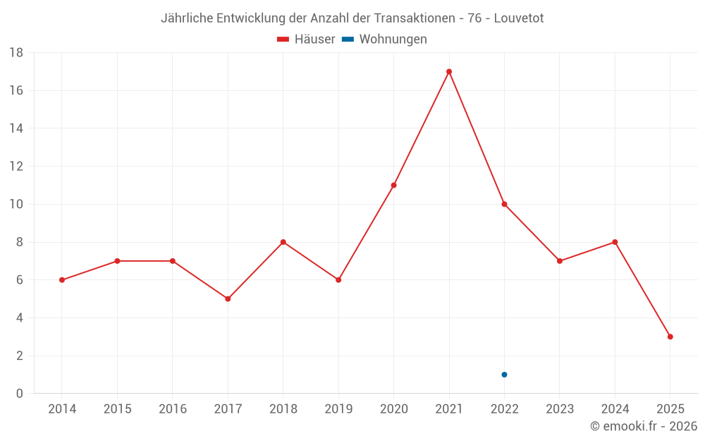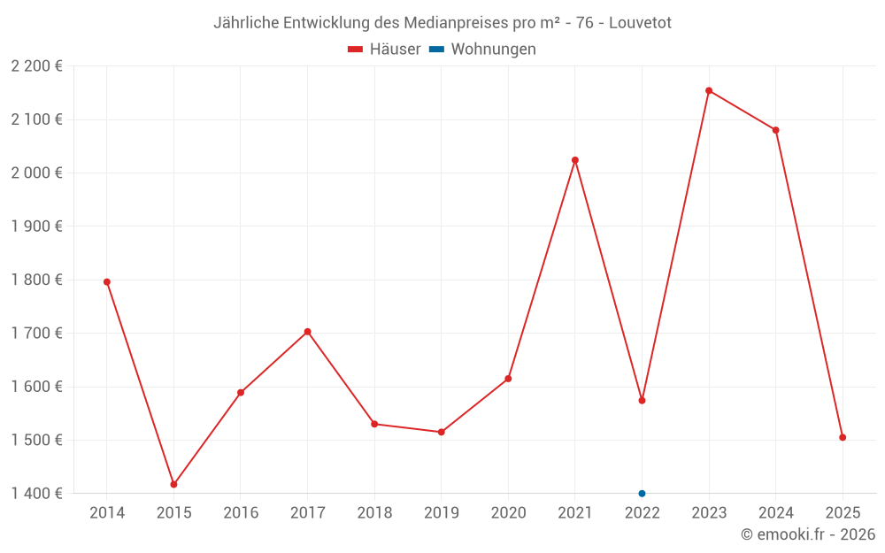 Der Durchschnittspreis auf den 15 Hausgeschäften der letzten 24 Monate in der Gemeinde Louvetot betrug 1 872 € pro Quadratmeter für einen mittleren Immobilienwert von 195 000 €. Über diesen Zeitraum hinweg lagen 60% der Transaktionen zwischen 1 590 und 2 157 € pro Quadratmeter (vom 2. bis zum 8. Dezil).